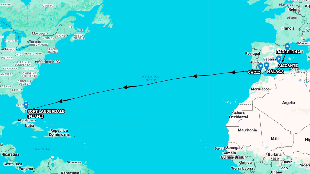 Una travesía de 13 días, partiendo desde Barcelona y vistando Alicante, Málaga y Cádiz antes de zarpar directos hacia Fort Lauderdale (Miami).